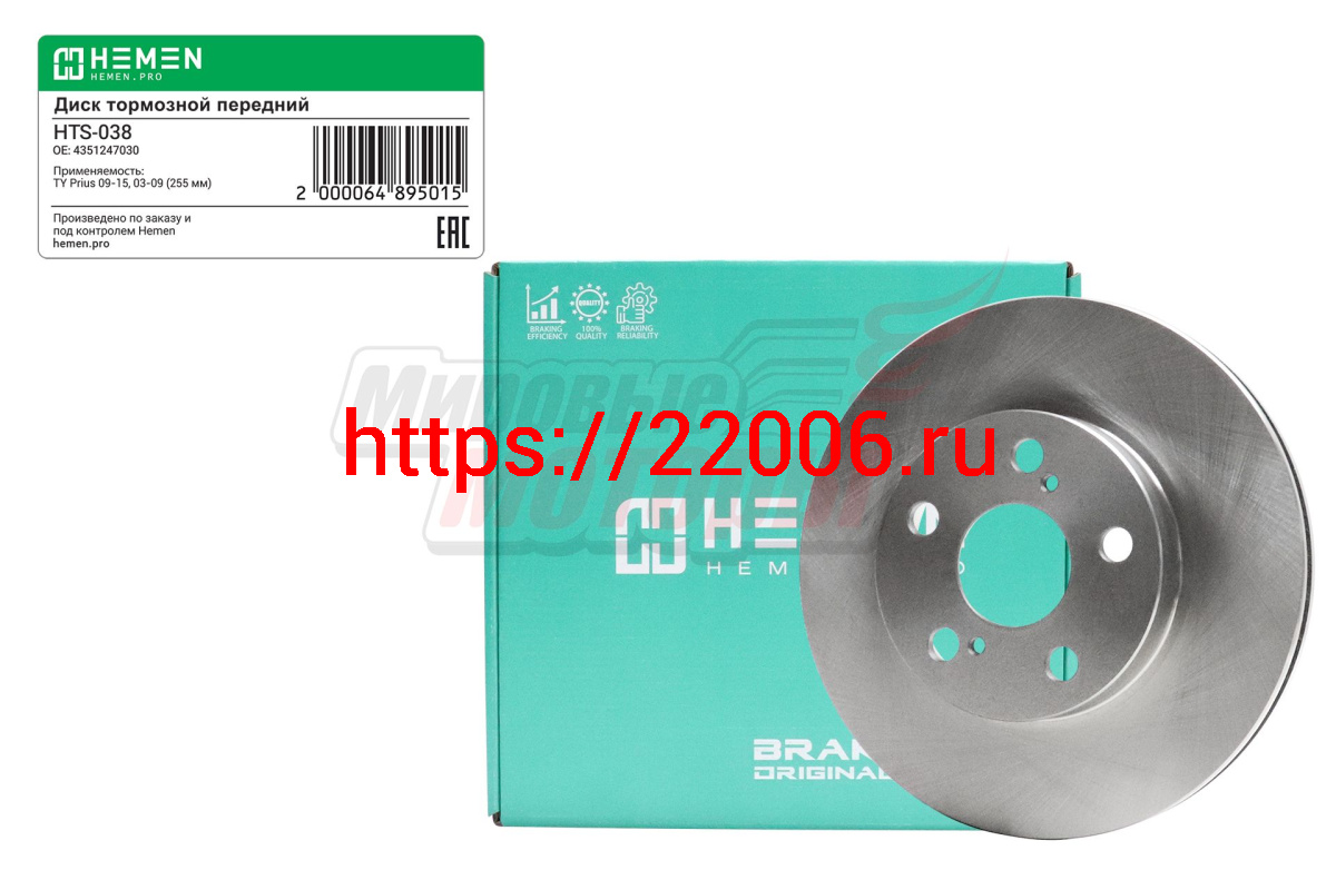 - Диск тормозной передний Toyota Prius 09-15, 03-09,диам. 255 мм (HTS038) в Березовском недорого